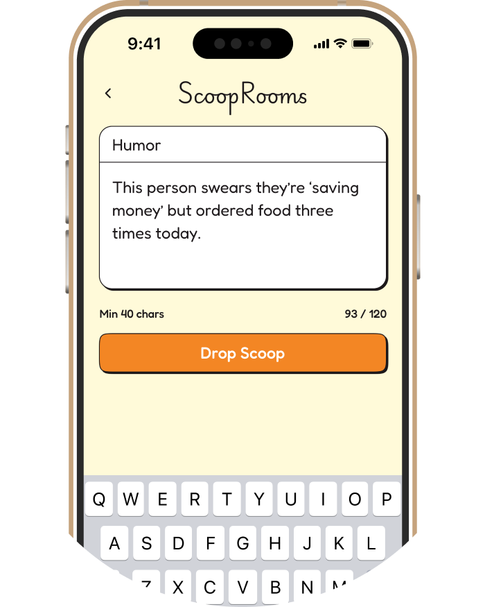 ScoopRooms is a social guessing game for friends.Post short scoops, add a vibe, and let your group guess who they think itโ€™s about.